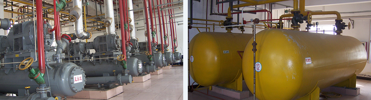 年產(chǎn)10萬噸無公害豬肉,總存儲噸位2964噸,涵蓋凍結(jié)間、冷藏間、 冷卻間、副產(chǎn)冷卻間 、鮮白條發(fā)貨間、鮮品發(fā)貨間共20間,采用氨(R717)制冷系統(tǒng),末端排管加冷風(fēng)機(jī)。熱氨加水融霜,掃霜加定期熱氨排油,熱氨融霜。
