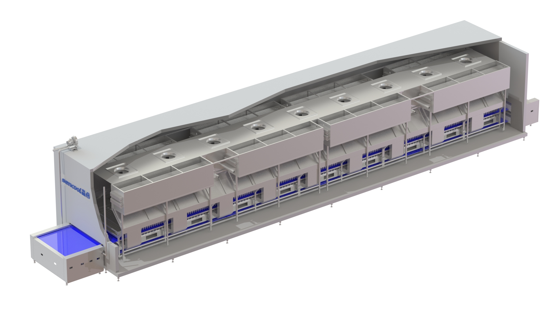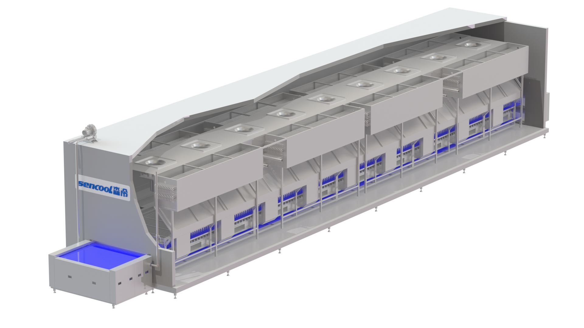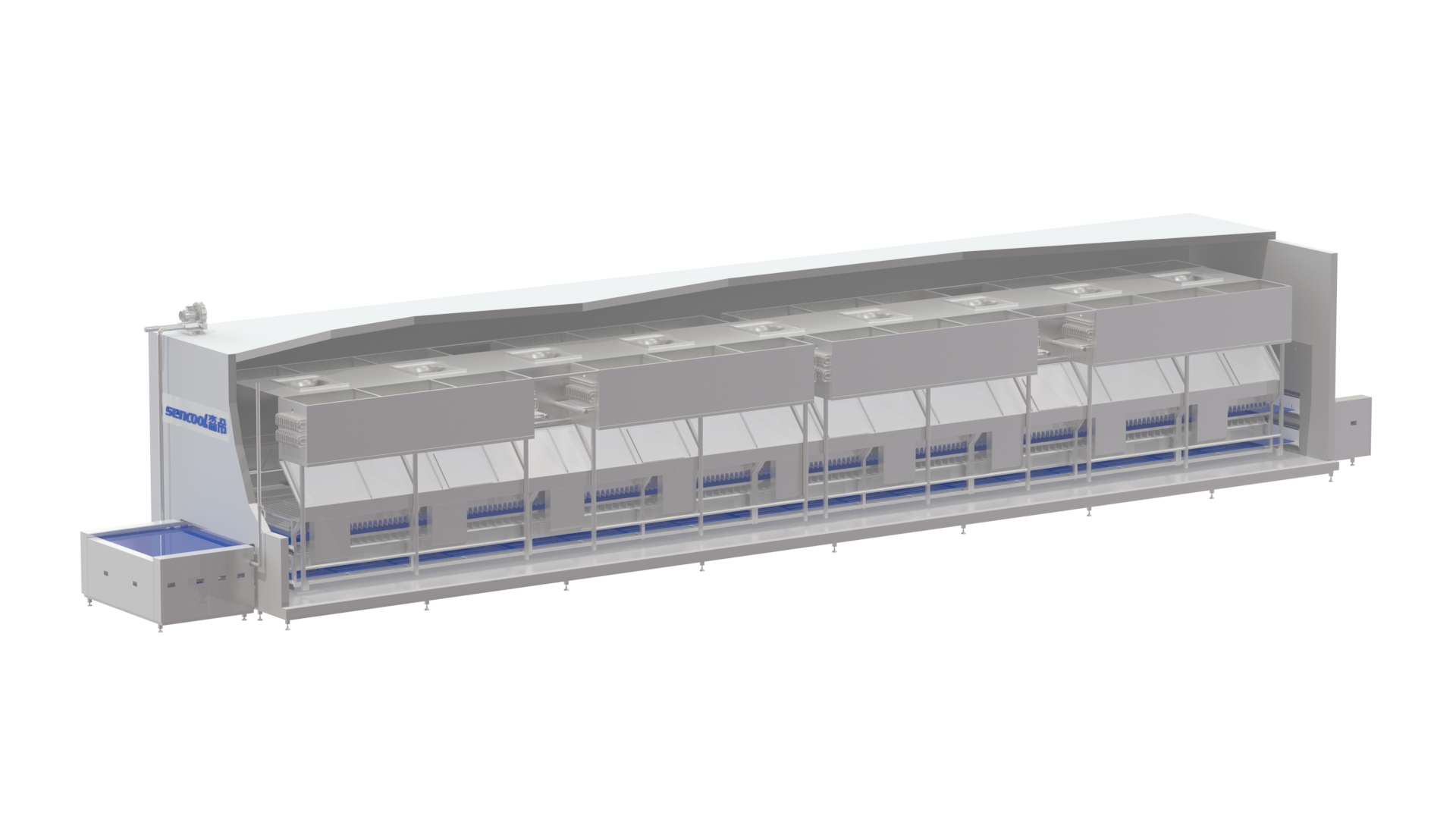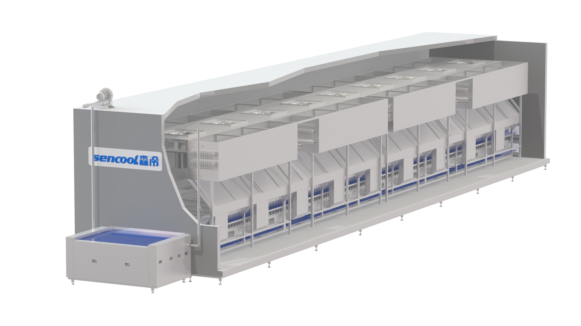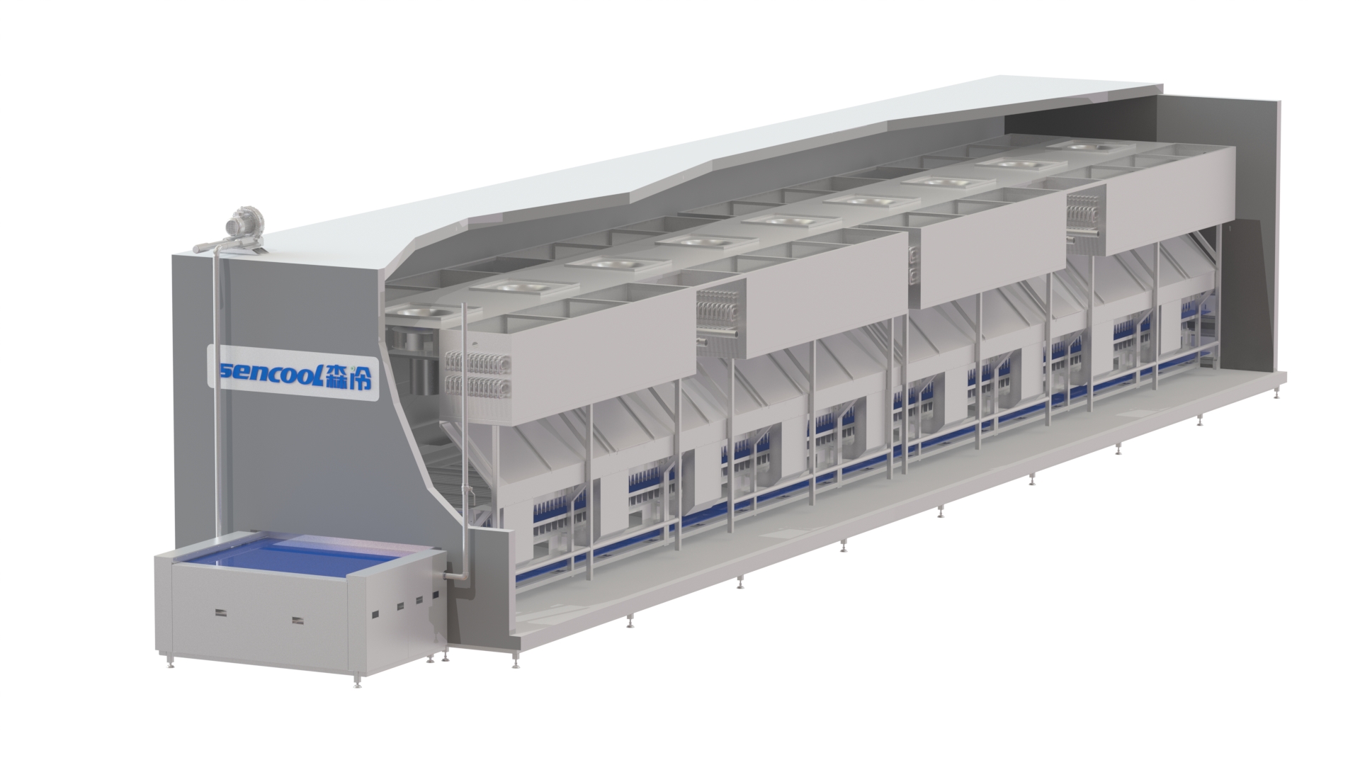 隧道網(wǎng)帶速凍機廣泛應用于各種水產(chǎn)品(單體蝦、蝦仁、魚類)掛冰衣的二次凍結(jié)。